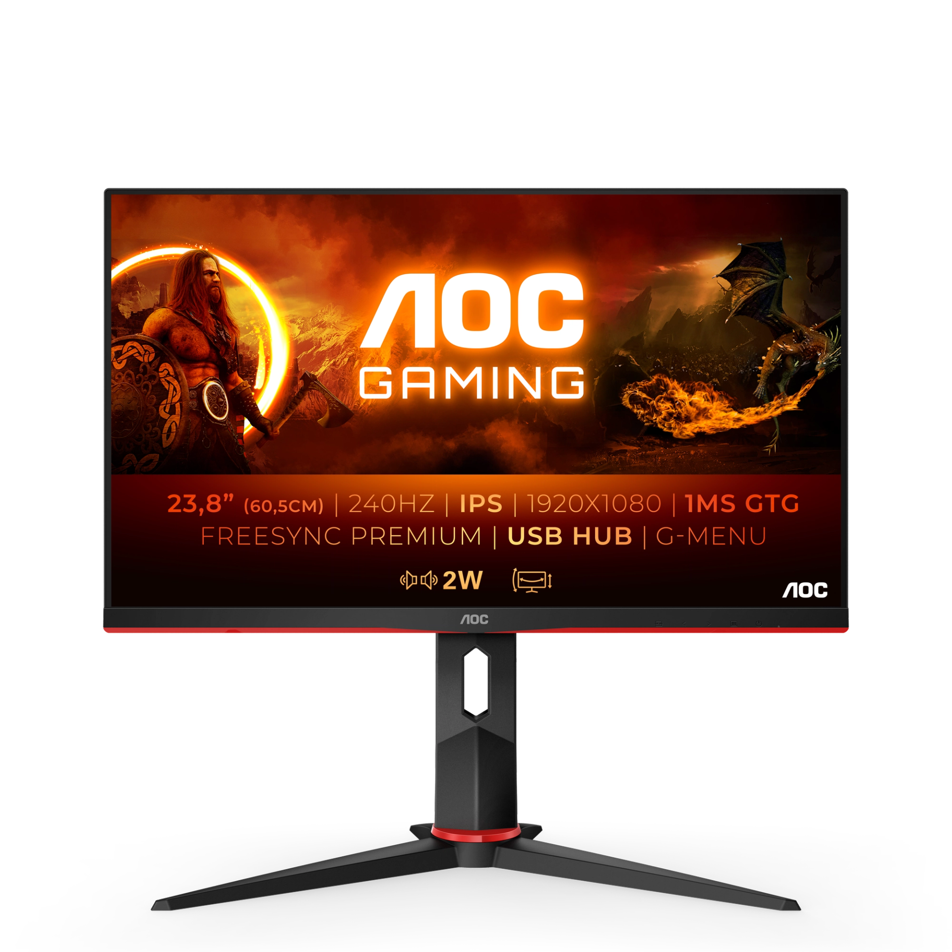 The AOC 24G2ZU guarantees stutter-free and smooth gameplay thanks to its 240Hz refresh rate, 0.5ms response time and low input lag. If features height adjustment and swivel function, as well as Adaptive Sync and G-Sync compatibility, for a fully customised gaming experience.